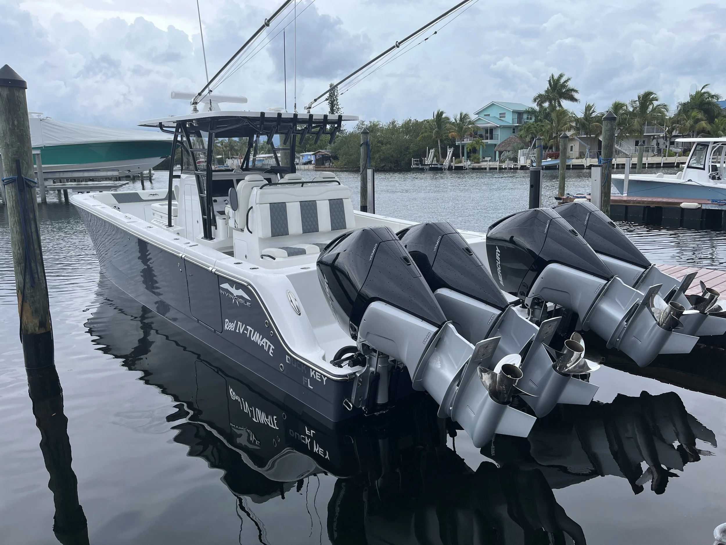 Our offshore vessel is a 2022 35’ 10" Invincible Catamaran with quadruple 300 Mercury V8’s. It has an 11’ 7.5” beam. It is a very stable beautiful new vessel that will get you there safely and in style with a smooth ride.